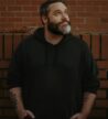 People are working on the interior renovation of a room that appears to be under construction. A worker on a scaffold is painting the ceiling, while others are seated or discussing the progress. The room has smooth, gray walls with arched recesses and a modern design vibe. There are tools and materials scattered around, including a ladder, paint cans, and some rocks or construction debris on the floor. Overhead, stylish pendant lights provide illumination as natural light streams in from windows.